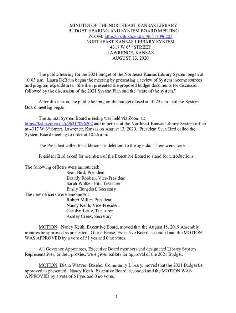 MINUTES OF THE NORTHEAST KANSAS LIBRARY BUDGET HEARING AND SYSTEM BOARD MEETING ZOOM: https://kslib.zoom.us/j/96317096202 NORTHEAST KANSAS LIBRARY SYSTEM 4317 W 6TH STREET LAWRENCE, KANSAS AUGUST