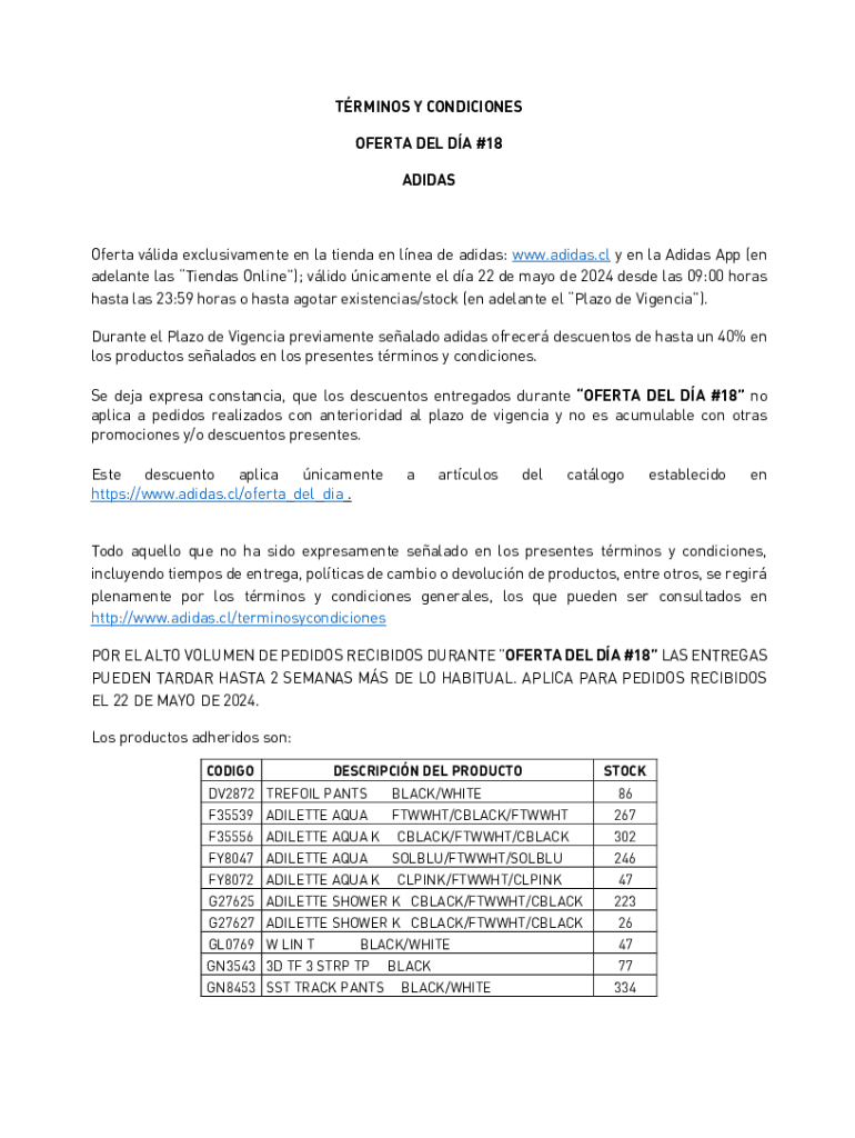 Describe la Omertà del Did #18 de Adidas, valid El 22 DE may ode 2024, con descents de pasta UN 40% en products seleccionados. ¡No the lo pairs!