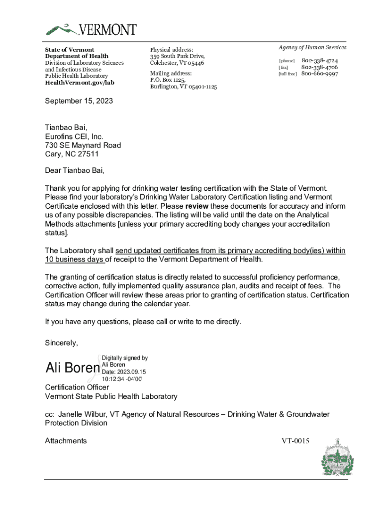 State of Vermont Department of Health Division of Laboratory Sciences and Infectious Disease Public Health Laboratory HealthVermont.gov/labPhysical address: 359 South Park Drive, Colchester, VT 05446