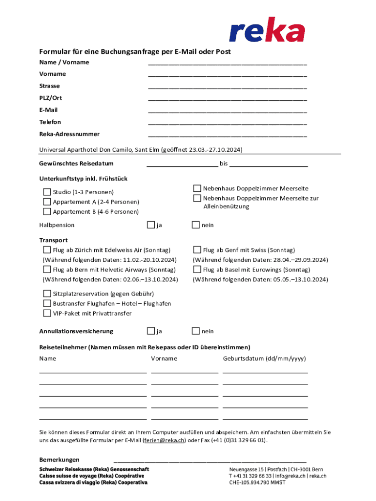 Formular fr eine Buchungsanfrage per EMail oder Post Name / Vorname___Vorname___Strasse___PLZ/Ort___EMail___Telefon___RekaAdressnummer___Universal Aparthotel Don Camilo, Sant Elm (geffnet 23.03.27.10.2024)