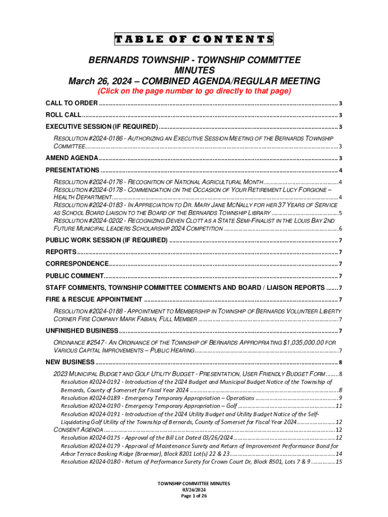 TABLE OF CONTENTS BERNARD TOWNSHIP TOWNSHIP COMMITTEE MINUTES March 26, 2024, COMBINED AGENDA/REGULAR MEETING (Click on the page number to go directly to that page) CALL TO ORDER ...............................................................................................................................................