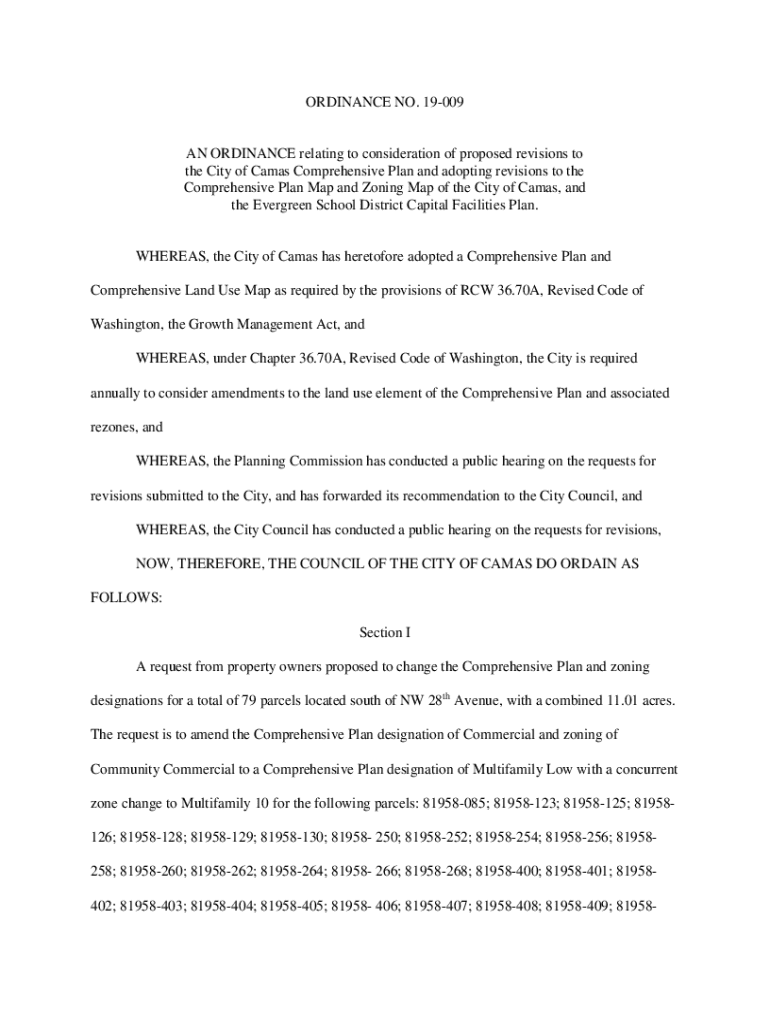 ORDINANCE NO. 19009AN ORDINANCE relating to consideration of proposed revisions to the City of Camas Comprehensive Plan and adopting revisions to the Comprehensive Plan Map and Zoning Map of the City