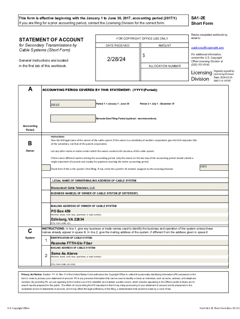 This form is for reporting cable systems\' secondary transmissions and gross receipts for the accounting period. It includes instructions for submission and contact information.