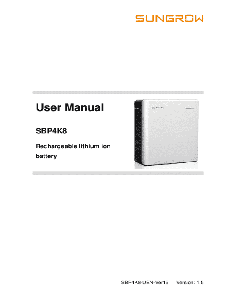 User Manual SBP4K8 Rechargeable lithium ion batterySBP4K8UENVer15Version: 1.5About this manual This manual is intended for the SBP4K8, the Sungrow 4.8 kWh battery. This manual does not include all