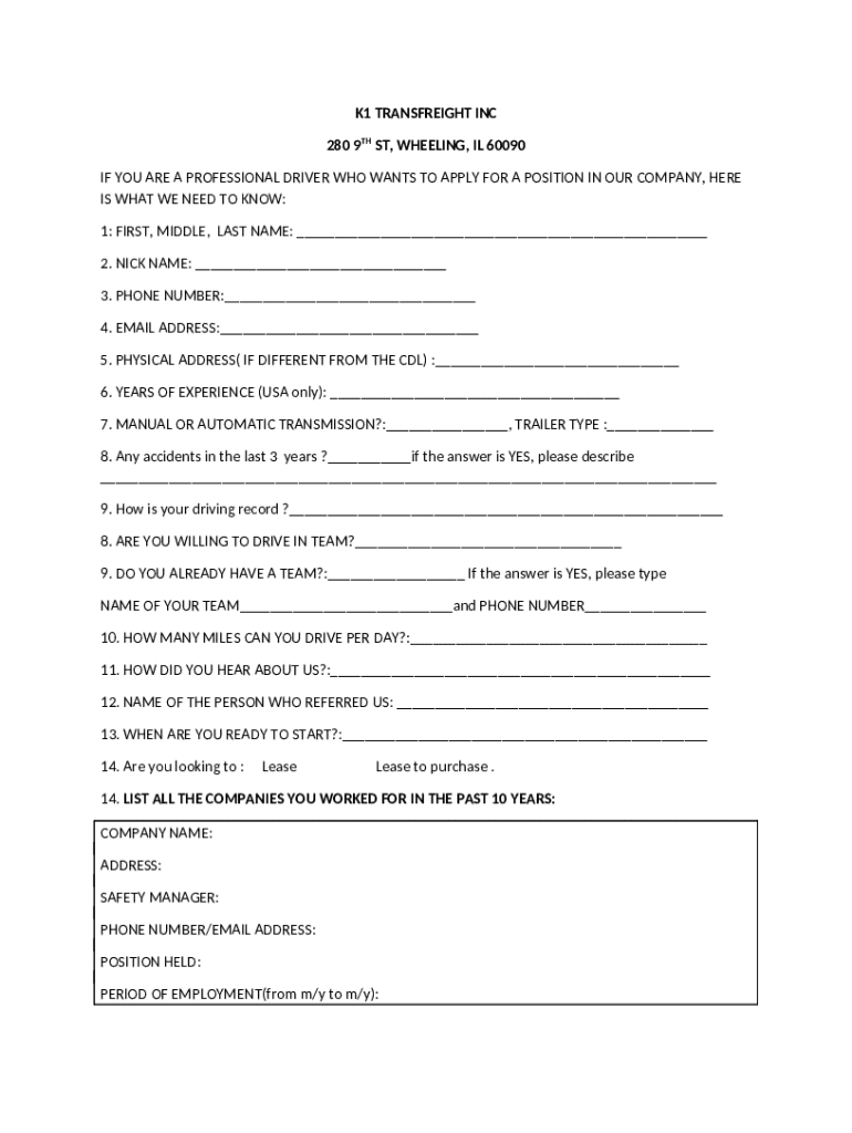 K1 Transfreight Inc: Truck Driving Jobs in Wheeling IL template instructions