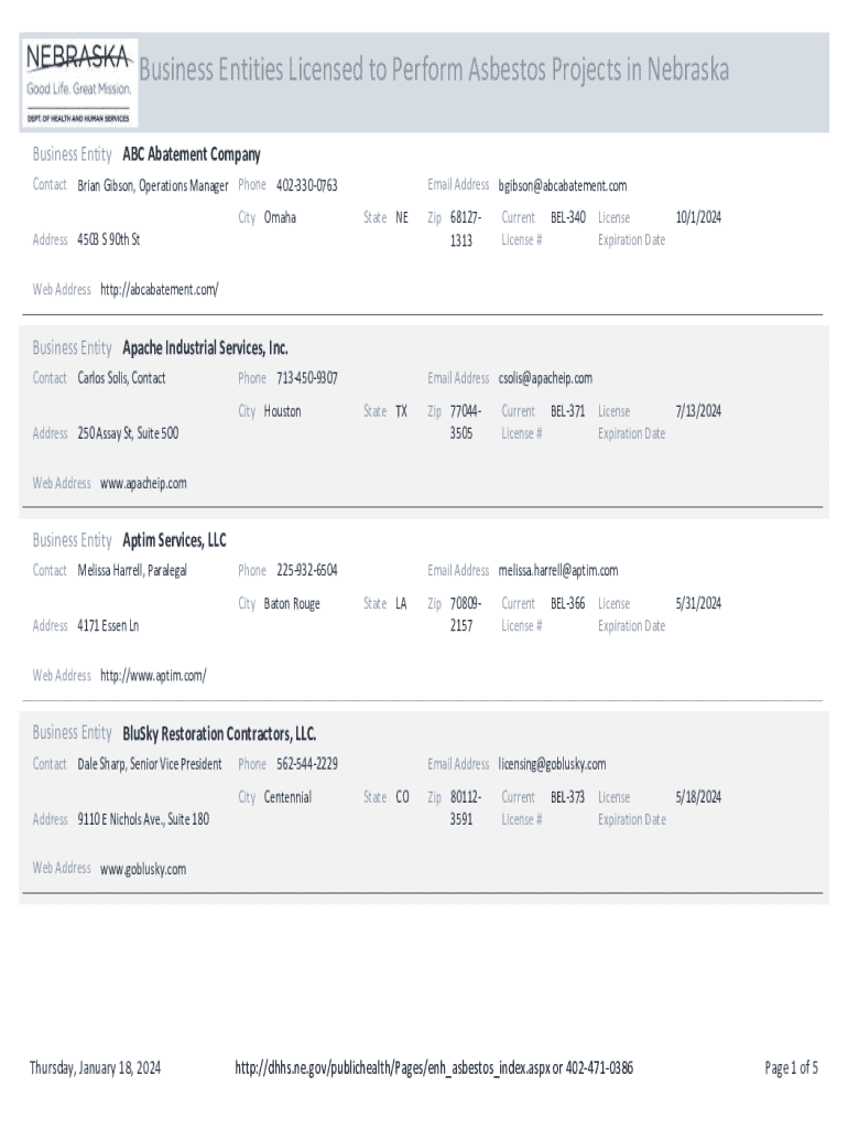 Business Entities Licensed to Perform Asbestos Projects in Nebraska Business Entity ABC Abatement Company ContactBrian Gibson, Operations Manager PhoneEmail Address bgibson@abcabatement.com4023300763City