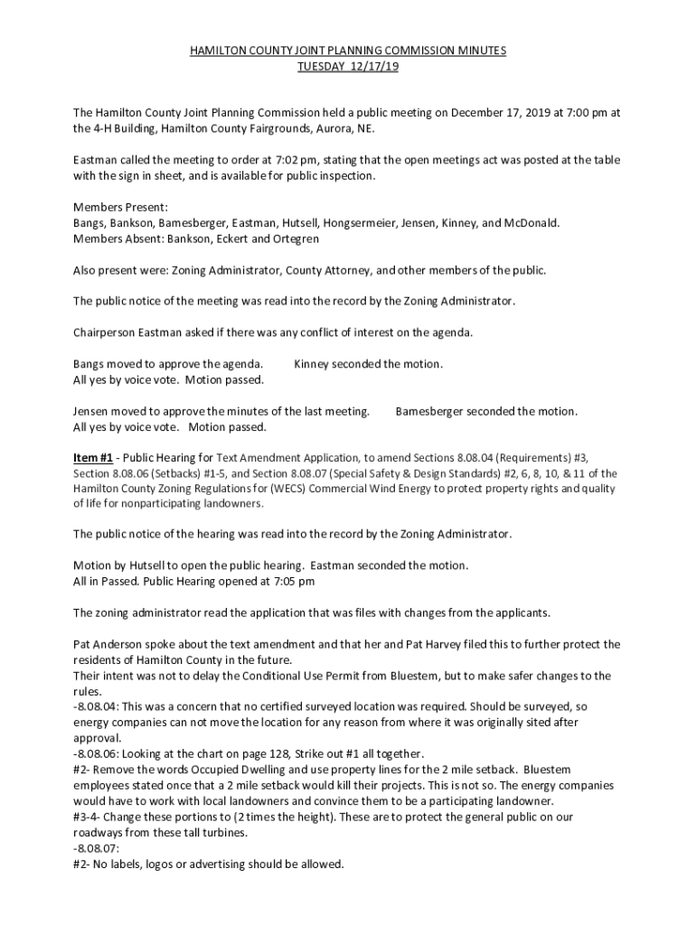 Detailed minutes from the Hamilton County Joint Planning Commission meeting discussing wind energy zoning amendments and public concerns on December 17, 2019.