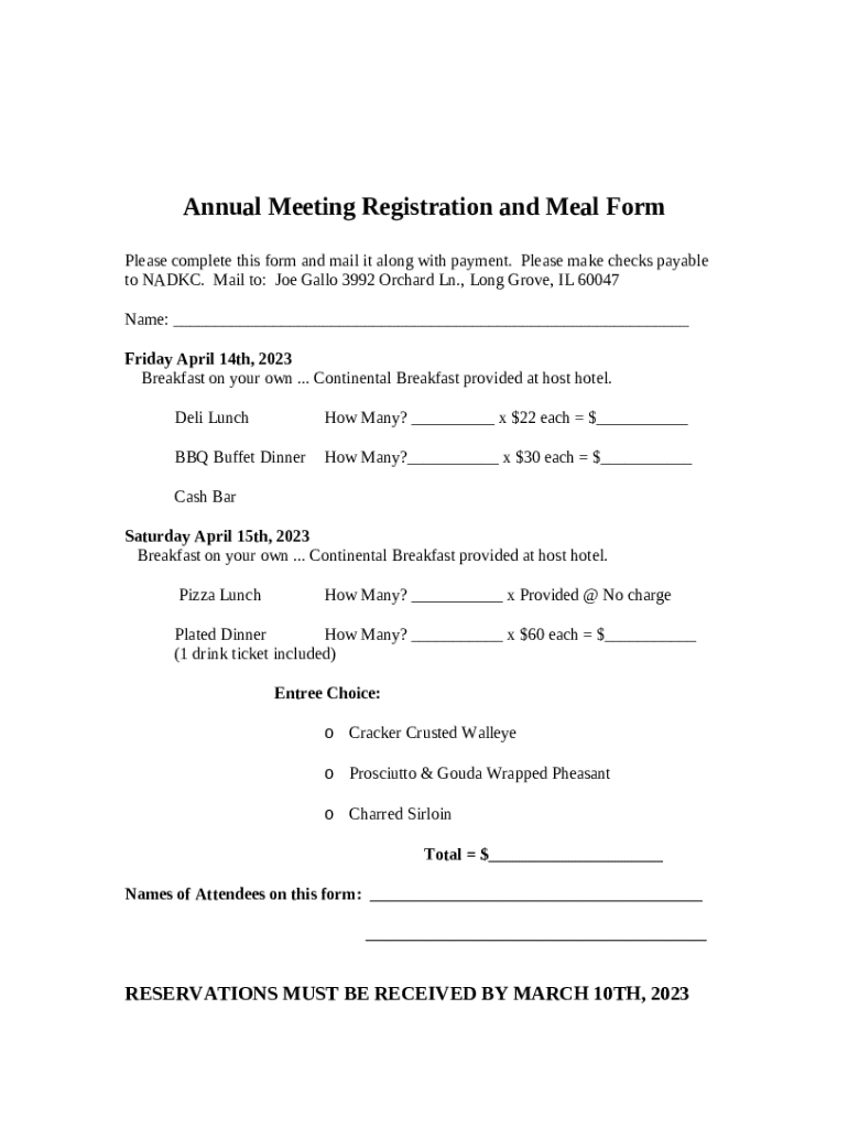 The Annual Meeting Registration and Meal is a Word document that should be submitted to the relevant address in order to provide specific information. It must be completed and signed, which is possible manually, or with a particular solution like PDFfiller. This tool helps to complete any PDF or Word document directly from your browser (no software requred), customize it according to your needs and put a legally-binding electronic signature. Right after completion, the user can easily send the Annual Meeting Registration and Meal to the relevant receiver, or multiple individuals via email or fax. The template is printable as well thanks to PDFfiller feature and options presented for printing out adjustment. In both electronic and physical appearance, your form should have a clean and professional look. Also you can turn it into a template to use later, so you don't need to create a new document from the beginning. All you need to do is to edit the ready template.