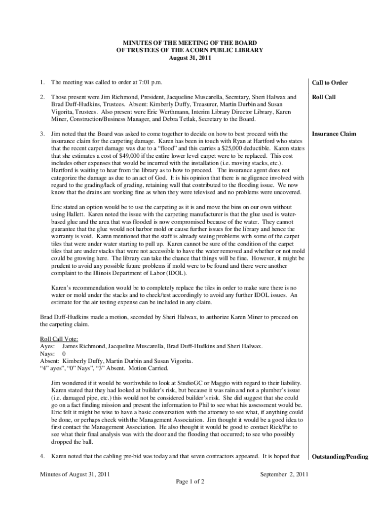 MINUTES OF THE MEETING OF THE BOARD OF TRUSTEES OF THE ACORN PUBLIC LIBRARY August 31, 20111. The meeting was called to order at 7:01 p.m. Call to Order2. Those present were Jim Richmond, President,