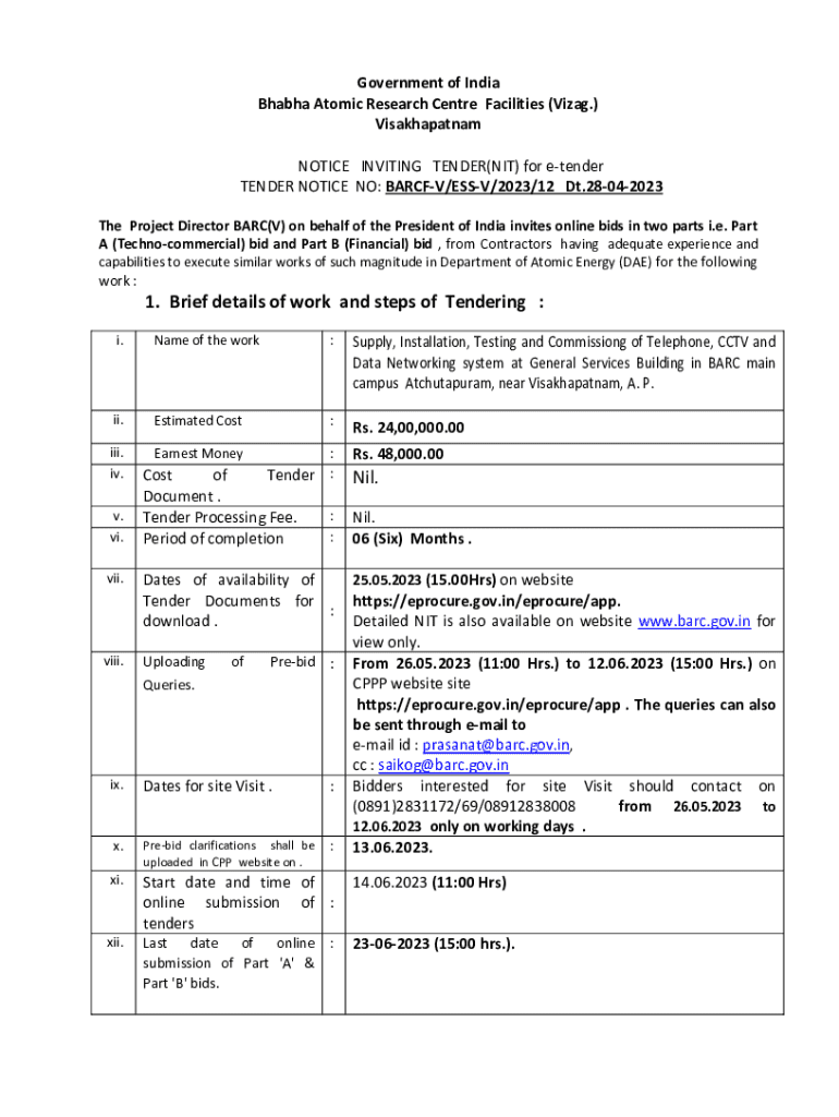 Inviting bids for telecommunication and network system installation at BAR, Visakhapatnam. Estimated cost: Rs. 24 Lakhs. Bid deadline: June 23, 2023.
