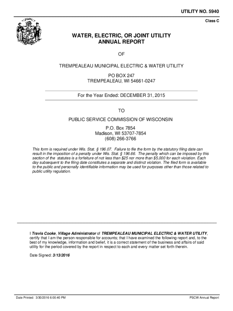 UTILITY NO. 5940 Class CWATER, ELECTRIC, OR JOINT UTILITY ANNUAL REPORT OF TREMPEALEAU MUNICIPAL ELECTRIC & WATER UTILITY PO BOX 247 TREMPEALEAU, WI 546610247 For the Year Ended: DECEMBER 31, 2015