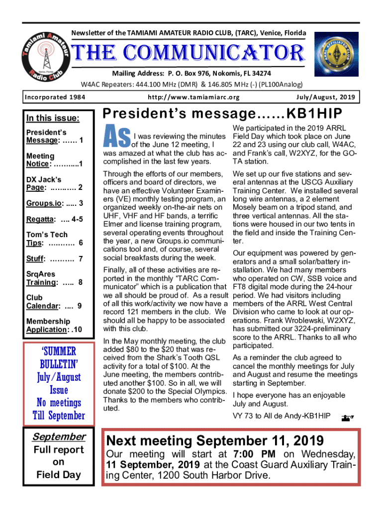 Newsletter of the TAMIAMI AMATEUR RADIO CLUB, (ARC), Venice, Fluoridate COMMUNICATOR Mailing Address: P. O. Box 976, Rooms, FL 34274 W4AC Repeaters: 444,100 MHz (DMR) & 146.805 MHz () (PL100Analog)