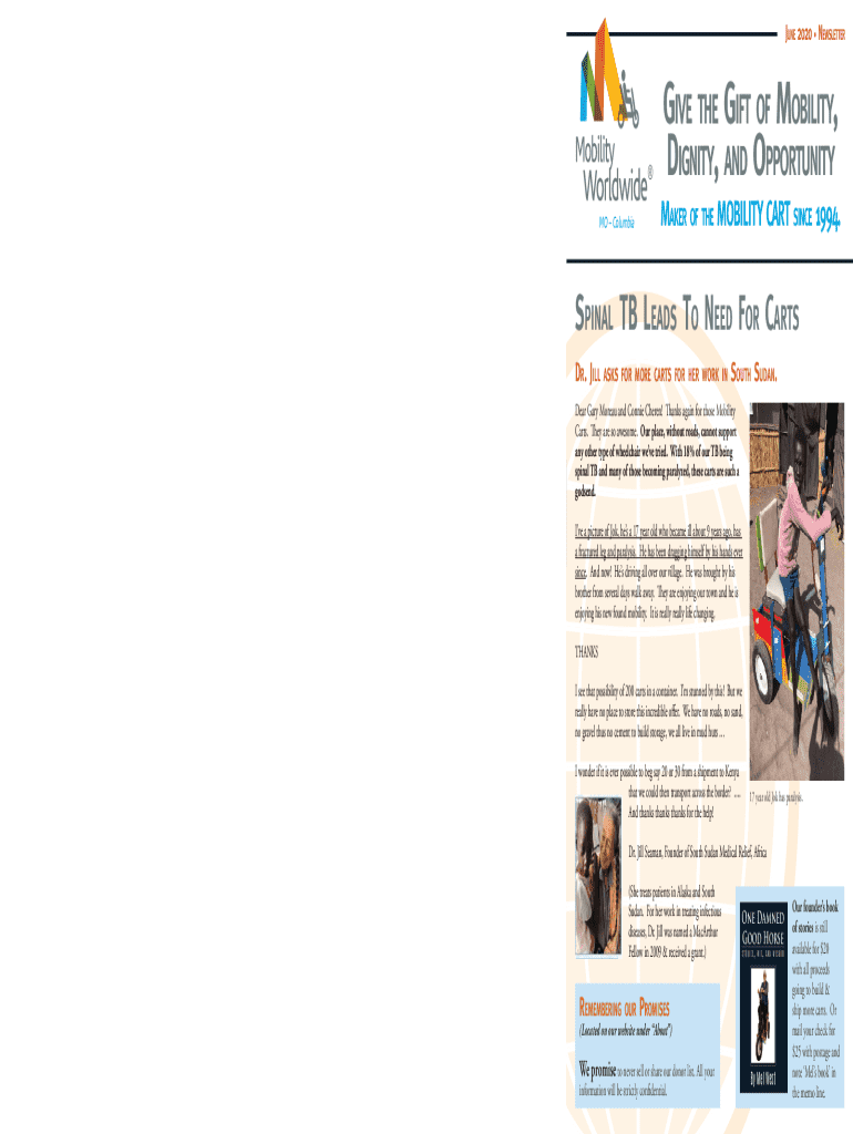 June 2020 NewsletterGrants Fund Equipment For New Workshop Thanks to a relatively mild winter, construction on the new Mel and Barbara West Cart Center, new home to Mobility Worldwide MO Columbia,