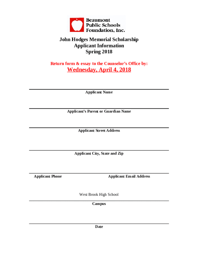 The Beaumont Public Schools Foundation / Scholarship ... is a writable document you can get filled-out and signed for certain needs. Next, it is furnished to the exact addressee in order to provide certain information of any kinds. The completion and signing is possible in hard copy by hand or using a suitable tool like PDFfiller. Such tools help to fill out any PDF or Word file online. While doing that, you can edit it for the needs you have and put a valid electronic signature. Upon finishing, you send the Beaumont Public Schools Foundation / Scholarship ... to the recipient or several recipients by email and also fax. PDFfiller provides a feature and options that make your Word form printable. It includes different options for printing out appearance. It does no matter how you'll deliver a form - in hard copy or electronically - it will always look well-designed and organized. To not to create a new document from scratch every time, make the original Word file as a template. After that, you will have an editable sample.