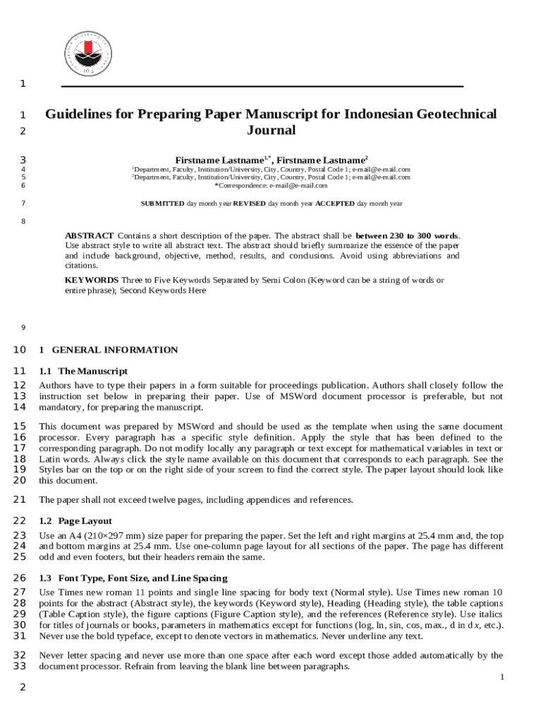 The Guidelines for Preparing Paper Manuscript for Indonesian Geotechnical Journal is a Word document that has to be completed and signed for specified purpose. Next, it is provided to the relevant addressee in order to provide some information of any kinds. The completion and signing is possible in hard copy by hand or using an appropriate tool like PDFfiller. Such tools help to complete any PDF or Word file online. While doing that, you can edit its appearance depending on your needs and put legit e-signature. Upon finishing, the user sends the Guidelines for Preparing Paper Manuscript for Indonesian Geotechnical Journal to the respective recipient or several of them by email and even fax. PDFfiller provides a feature and options that make your Word form printable. It includes a number of settings when printing out appearance. No matter, how you send a form - in hard copy or electronically - it will always look well-designed and organized. In order not to create a new document from scratch all the time, turn the original form into a template. After that, you will have a rewritable sample.