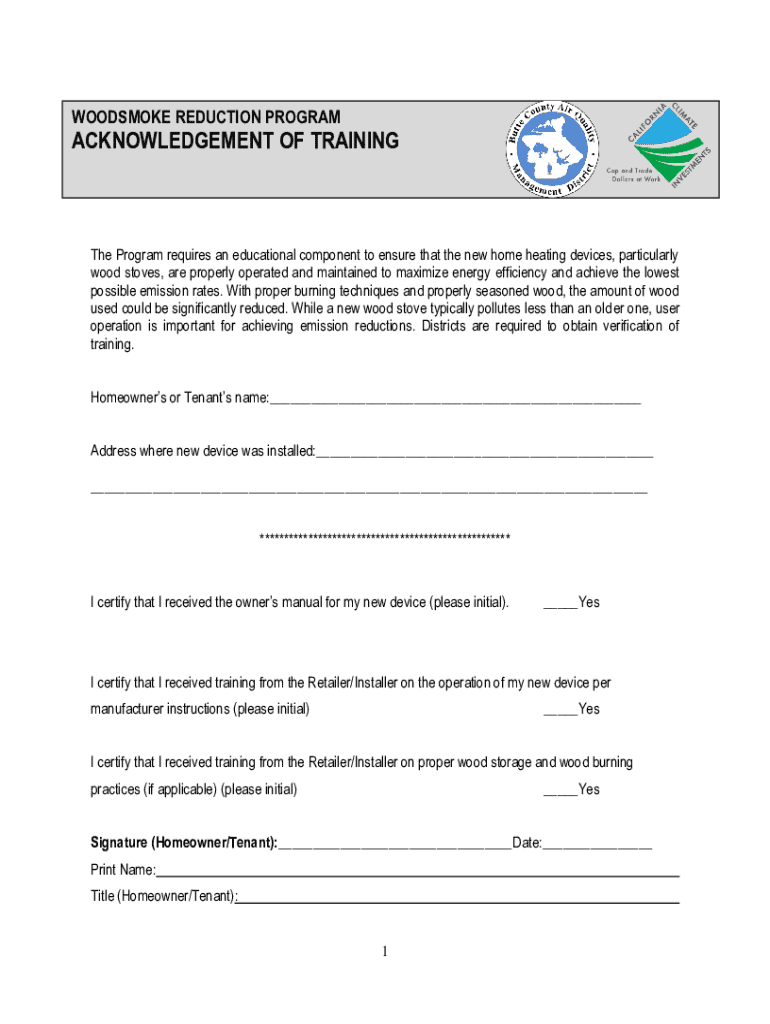 Get the free Woodssmoke Reduction Program Acknowledgement of Training