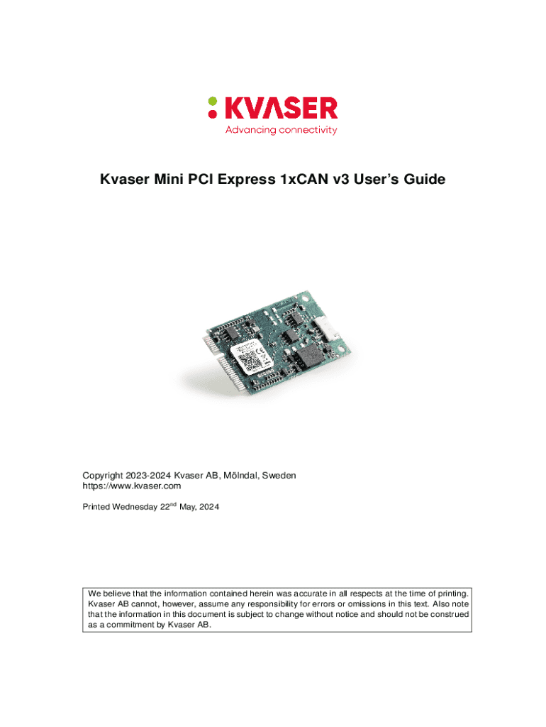 Entities or individuals utilizing Kvaser Mini PCI Express for CAN communications in applicable systems or networks may be required to file for compliance or registration, typically depending on local regulations.
