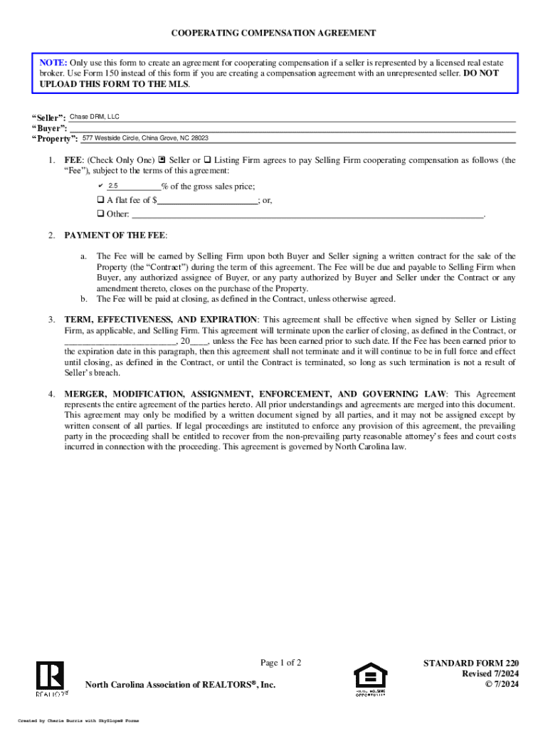 COOPERATING COMPENSATION AGREEMENT NOTE: Only use this form to create an agreement for cooperating compensation if a seller is represented by a licensed real estate broker. Use Form 150 instead of