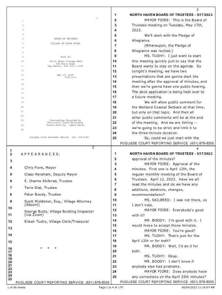 3 1 1NORTH HAVEN BOARD OF TRUSTEES 5/17/2023 MAYOR FIORE: This is the Board of1223Trustees meeting on Tuesday, May 17th,342023.45 BOARD OF TRUSTEES5VILLAGE OF NORTH HAVEN6We\'ll start with the Pledge of Allegiance.6(Whereupon, the Pledge of77Allegiance was recited.)889MS. TUOHY: I just want to start10this meeting quickly just to say that the11Board wants to stay on the agenda. So12tonight\'s meeting, we have two13presentations that are