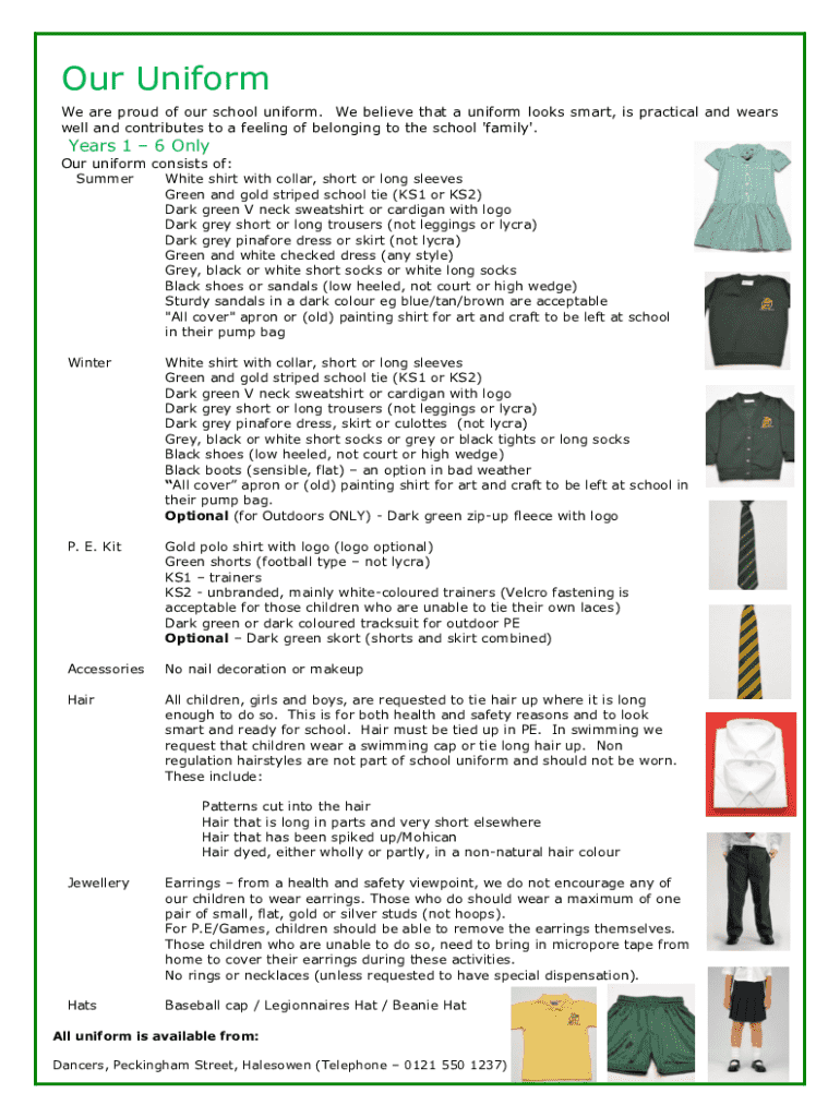 Our Uniform We are proud of our school uniform. We believe that a uniform looks smart, is practical and wears well and contributes to a feeling of belonging to the school \'family\'. Years 1 6 Only