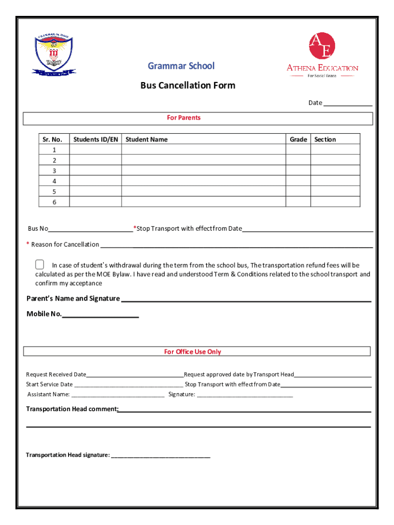 Use this Bus Cancellation Form for Grammar School to withdraw transport services effectively. Ensure to follow terms & conditions for refunds.