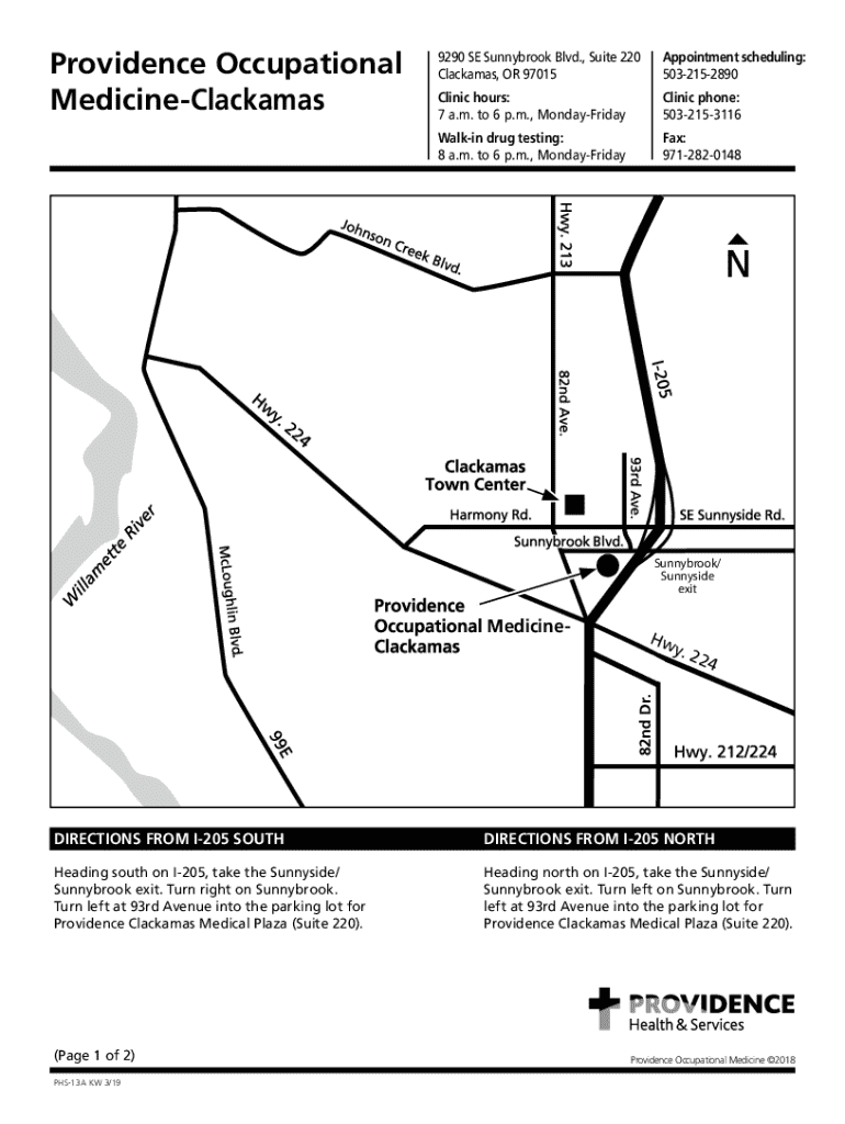 Providence Occupational MedicineClackamas9290 SE Sunny brook Blvd., Suite 220 Clacks, OR 97015Appointment scheduling: 5032152890Clinic hours: 7 a.m. to 6 p.m., MondayFridayClinic phone: 5032153116Walkin