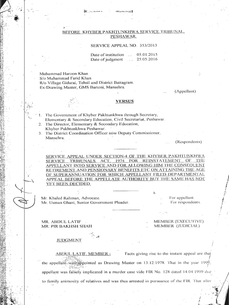 ,A,5:ftr\'^\'BEFORE KHYBERPATgrnJmiIWA SERVICE rillBUNAT.. PESHAWAR. SERVICE APPEAL NO. 353/2013 Date of institution ... 05.01.2015 Date of judgment ... 25.05.2016ifMuhammad Haroon Khan S/o Muhammad Farid Khan R/o Village Gidarai, Tehsil and District Battagram. ExDrawing Master, GMS Bartoni, Mansehra.IfiffiW (Appellant)IKVERSUS(1?^il\" S,.e K :\'iV it 1. The Government of Khyber Pakhtunkhwa through Secretary, Elementary & Secondary Education, Civil Secretariat, Peshawar 2