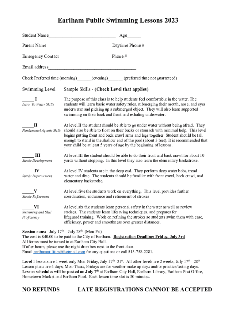 Fill out your earlham public swimming lessons online with pdfFiller!