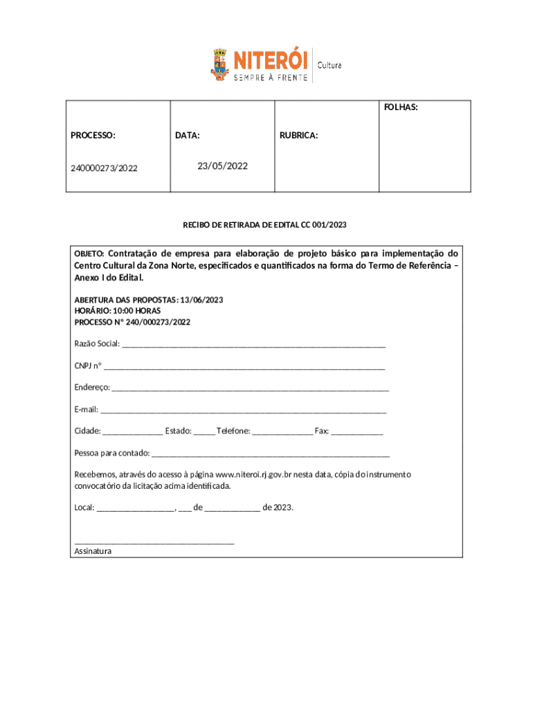 Template OBJETO: Contratao de empresa para elaborao de projeto bsico para implementao do Centro Cultural da Zona Norte, especificados e quantificados na a do Termo de Referncia Anexo I do Edital instructions