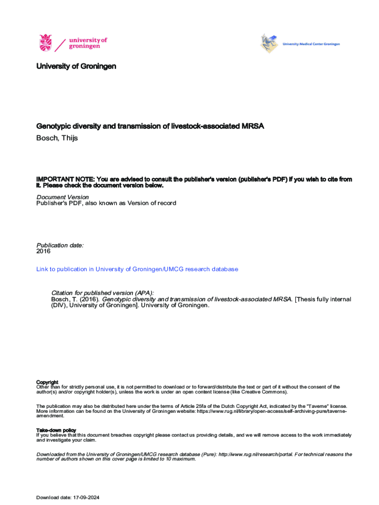 University of GroningenGenotypic diversity and transmission of livestock associated MRSA