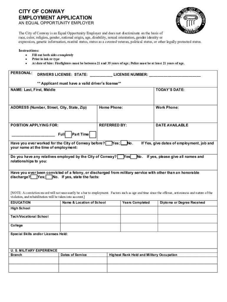 CITY OF CONWAY EMPLOYMENT APPLICATIONAN EQUAL OPPORTUNITY EMPLOYERThe City of Conway is an Equal Opportunity Employer and does not discriminate on the basis of race, color, religion, gender, national