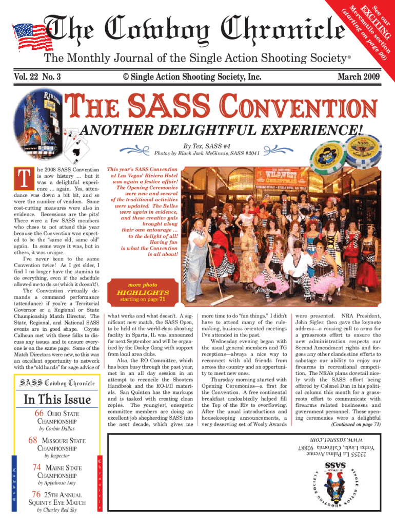n r G ou IN ctio 90) e e e Se IT e s ag C l X ti p E can on g er in M art t (sNovember 2001 2001 Cowboy Cowboy Chronicle Chronicle November 2001 Cowboy Chronicle NovemberPage 111 Page PageThe Cowboy ChronicleThe Monthly Journal of the Single Action Shooting Society Vol. 22 No. 3 Single Action Shooting Society, Inc.March 2009THE SASS CONVENTION ANOTHER DELIGHTFUL EXPERIENCE!. he 2008 SASS Convention is now history but it was a delightful experience again. Yes, attendance