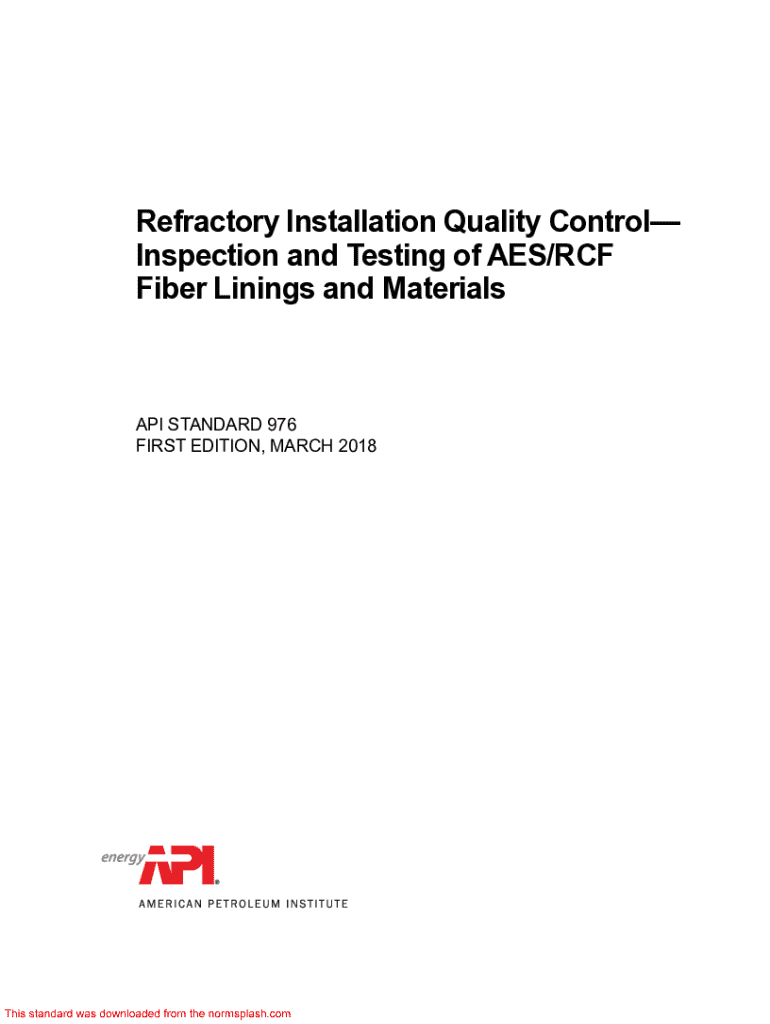Refractory Installation Quality Control Inspection and Testing of AES/RCF Fiber Linings and Materials API STANDARD 976 FIRST EDITION, MARCH 2018Special Notes API publications necessarily address problems