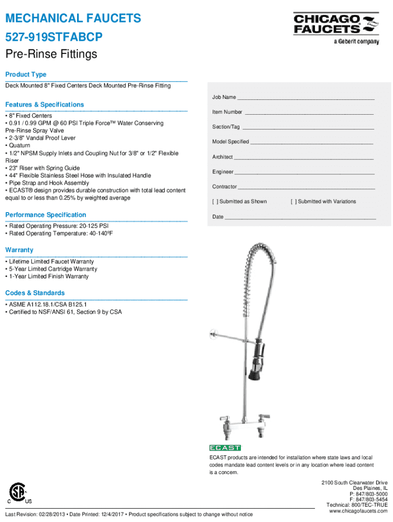 Discover the features of Chicago Faucets\' 527-919STFABCP pre-rinse fitting, including water conservation, lead-free design, and lifetime warranties.