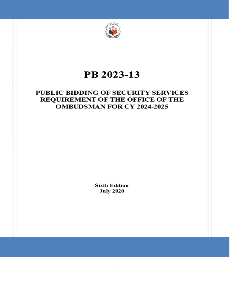 PB 202313 PUBLIC BIDDING OF SECURITY SERVICES REQUIREMENT OF THE OFFICE OF THE OMBUDSMAN FOR CY 20242025Sixth Edition July 20201Table of Contents Glossary of Acronyms, Terms, and Abbreviations .3 Section I. Invitation to Bid..6 Section II. Instructions to Bidders...10 1. 2. 3. 4. 5. 6. 7. 8. 9. 10. 11. 12. 13. 14. 15. 16. 17. 18. 19. 20. 21.Scope of