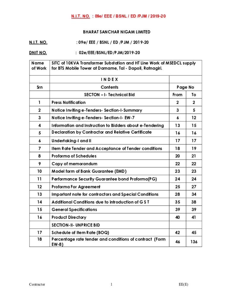 N.I.T. NO. : 09e/ EEE / BSNL / ED /PJM / 201920 BHARAT SANCHAR NIGAM LIMITED N.I.T. NO.: 09e/ EEE / BSNL / ED /PJM / 201920DNIT NO.: 02e/EEE/BSNL/ED/PJM/201920Name of WorkSITC of 10KVA Transformer Substation and HT Line Work of MSEDCL supply for BTS Mobile Tower at Damame, Tal Dapoli, Ratnagiri. INDEXSrnContents SECTON I Technical BidPage No FromTo1Press Notification222Notice Inviting eTenders SectionISummary353Notice Inviting eTenders SectionI