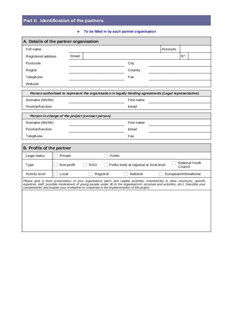 The Looking for partners and applicants for Strategic Partnerships is a fillable form in MS Word extension that can be filled-out and signed for specified purpose. In that case, it is provided to the relevant addressee to provide specific details of any kinds. The completion and signing is able or using an appropriate application e. g. PDFfiller. These tools help to fill out any PDF or Word file without printing them out. While doing that, you can edit its appearance according to your needs and put a valid digital signature. Once finished, you send the Looking for partners and applicants for Strategic Partnerships to the respective recipient or several ones by mail or fax. PDFfiller offers a feature and options that make your Word form printable. It provides different settings when printing out. It doesn't matter how you'll file a form - physically or by email - it will always look neat and organized. To not to create a new document from scratch again and again, make the original file into a template. Later, you will have a rewritable sample.