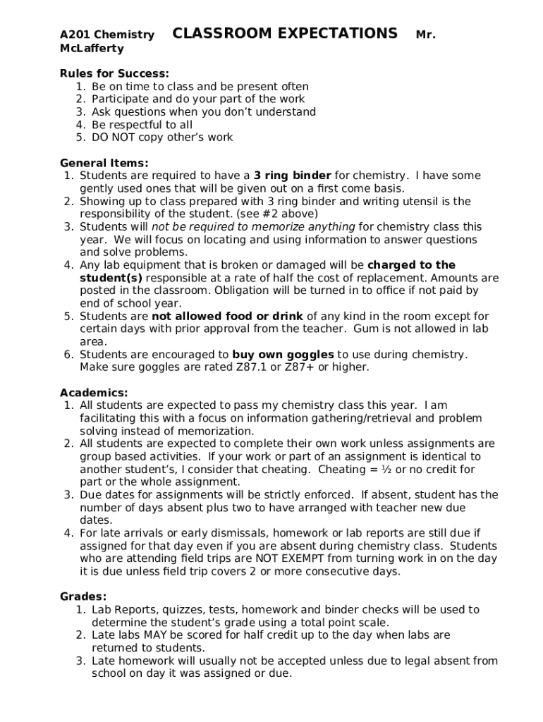 Expectations for success in Mrs. Smith's Chemistry Class. template instructions