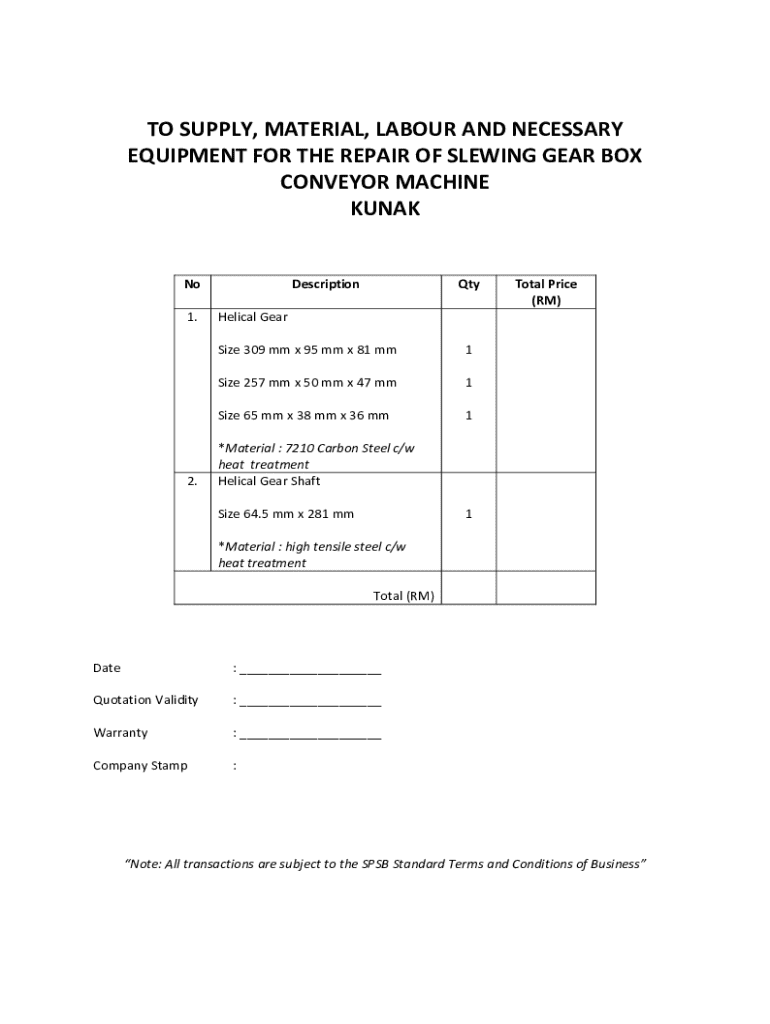 TO SUPPLY, MATERIAL, Labor AND NECESSARY EQUIPMENT FOR THE REPAIR OF SLEWING GEAR BOX CONVEYOR MACHINE Guano 1.2. DescriptionQtyTotal Price (RM)Helical Gear Size 309 mm x 95 mm x 81 mm1Size 257 mm