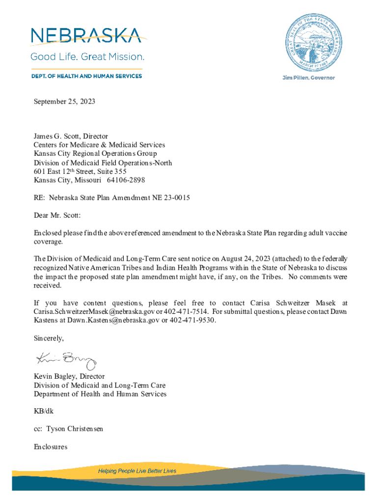 This document details the Nebraska State Plan Amendment NE 23-0015, addressing adult vaccine coverage effective October 1, 2023, with federal budget impact outlined.
