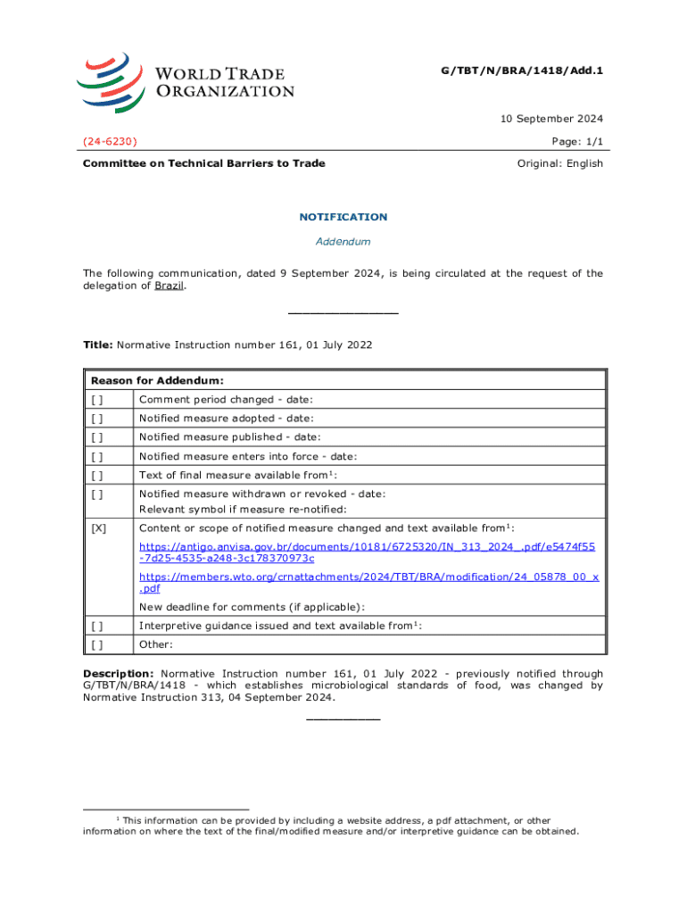 This document provides an addendum to Brazil\'s Normative Instruction number 161, detailing updates on microbiological standards for food with links to final measures.