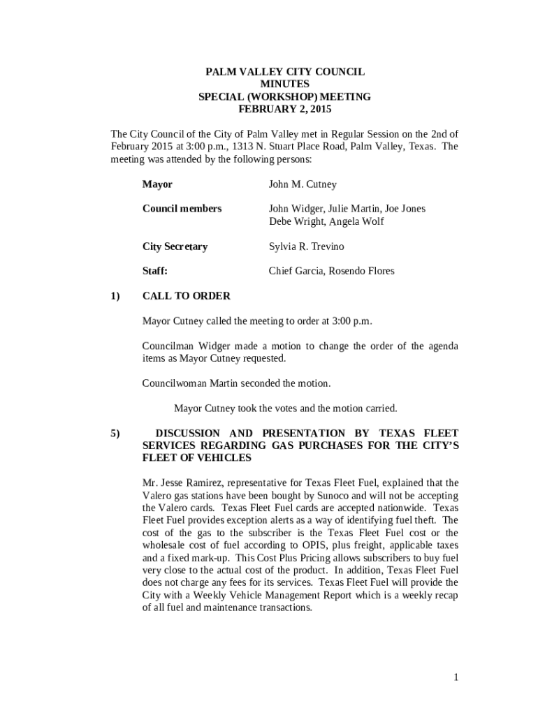 - Get the The City Council of the City of Palm Valley met in Regular Session on the 2nd of February 2015 at 3:00 p form in PDFfiller’s filebase.