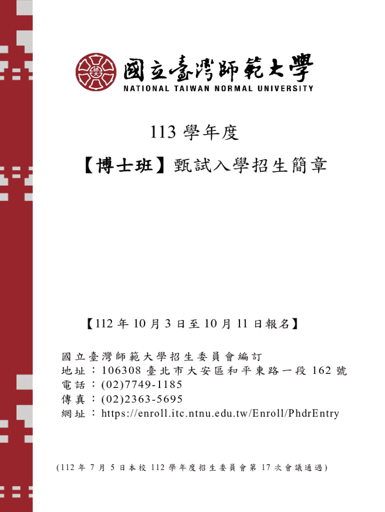 113 112 10 3 10 11 106308 162 (02)77491185 (02)23635695 https://enroll.itc.ntnu.edu.tw/Enroll/PhdrEntry( 11 2 7 5 11 2 1 7 ) 113 112