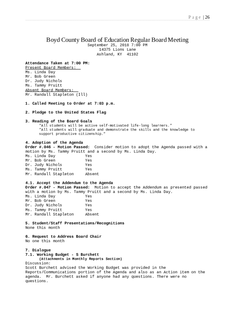 The Boyd County Board of Education Regular Board Meeting is a writable document you can get filled-out and signed for specified purposes. In that case, it is furnished to the relevant addressee to provide certain info of any kinds. The completion and signing is able manually in hard copy or using a suitable service like PDFfiller. These tools help to send in any PDF or Word file online. It also lets you customize its appearance for your requirements and put an official legal digital signature. Once finished, you send the Boyd County Board of Education Regular Board Meeting to the recipient or several recipients by email and even fax. PDFfiller has got a feature and options that make your Word template printable. It offers different options for printing out. It doesn't matter how you'll deliver a form - physically or electronically - it will always look well-designed and firm. To not to create a new file from scratch all the time, turn the original file into a template. Later, you will have an editable sample.