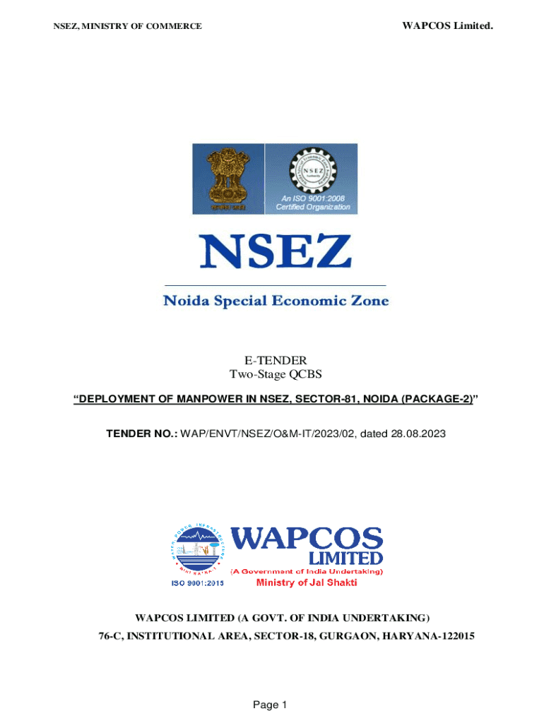 WAPCOS Limited.NSEZ, MINISTRY OF COMMERCEETENDER TwoStage QCBS DEPLOYMENT OF MANPOWER IN NSEZ, SECTOR81, NOIDA (PACKAGE2) TENDER NO.: WAP/ENVT/NSEZ/O&MIT/2023/02, dated 28.08.2023WAPCOS LIMITED (A GOVT. OF INDIA UNDERTAKING) 76C, INSTITUTIONAL AREA, SECTOR18, GURGAON, HARYANA122015Page 1WAPCOS Limited.NSEZ, MINISTRY OF COMMERCETable of Contents SectionI: Notice Inviting Tender (NIT) 1 SectionII Instructions to Bidders (ITB) 5 2.1 Introduction.....................