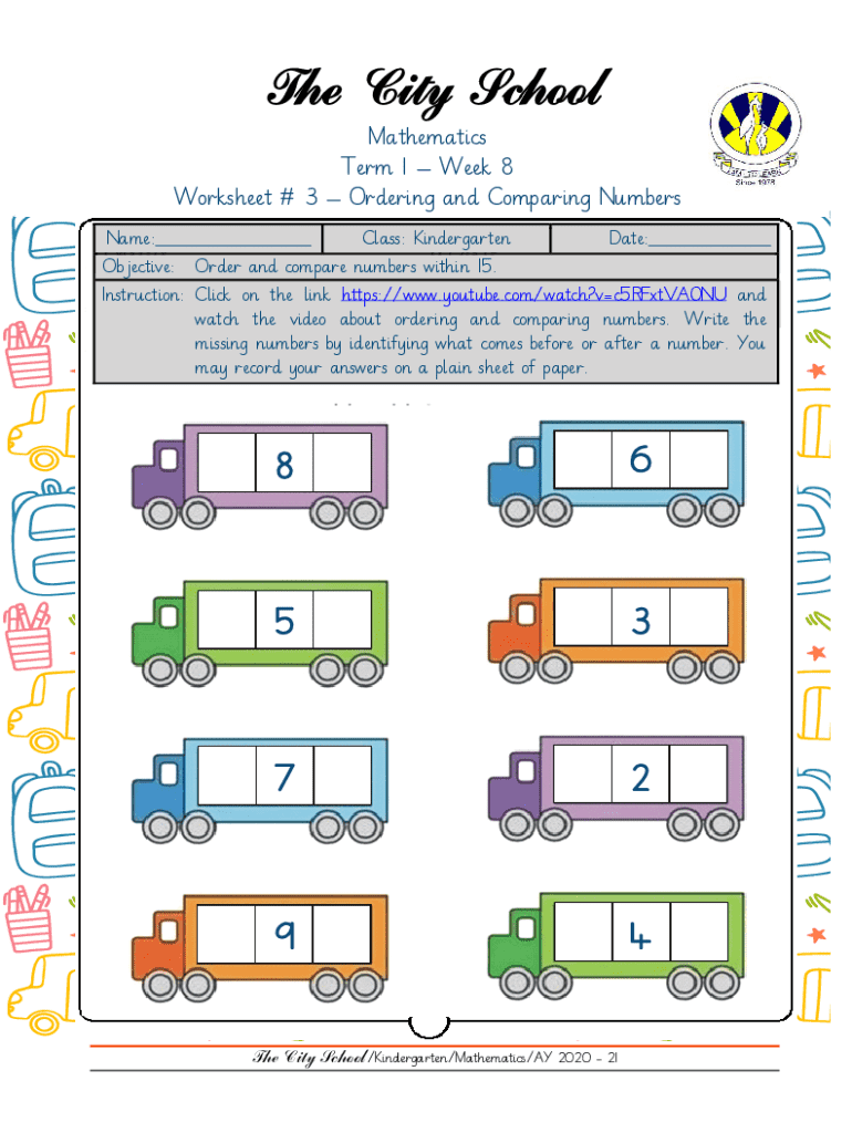 This worksheet for Kindergarten students aims to help them order and compare numbers within 15, featuring engaging instructions and a video link.