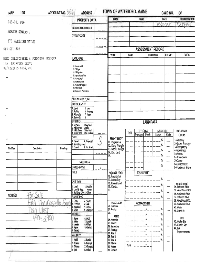MAPLOTACCOUNT NO. 5&(TOWN OF WATERLOO, MISADDRESS PROPERTY DATAO1S00180GCARD NO.PAGEBOOKDATeCONSIDERATION?/...27C?NEIGHBORHOOD COD EOF\” 7 S?\”\'?\”10HERSOM EDWARD J STREET CODE175 FAIRVIEW