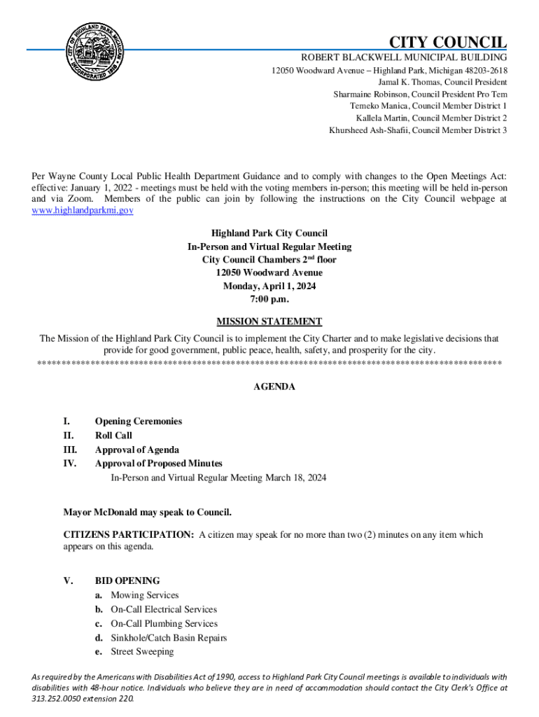 CITY COUNCIL ROBERT BLACKWELL MUNICIPAL BUILDING 12050 Woodward Avenue Highland Park, Michigan 482032618 Jamal K. Thomas, Council President Sharmaine Robinson, Council President Pro Tem Temeko Manica,