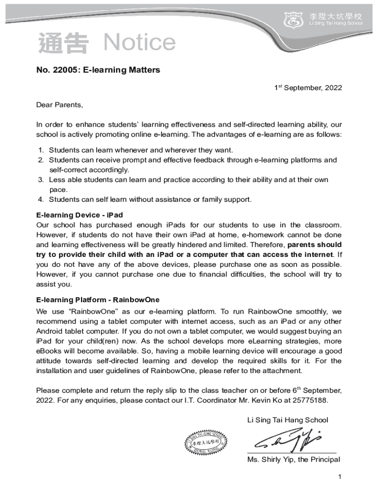 No. 22005: Elearning Matters 1st September, 2022 Dear Parents, In order to enhance students learning effectiveness and selfdirected learning ability, our school is actively promoting online elearning.