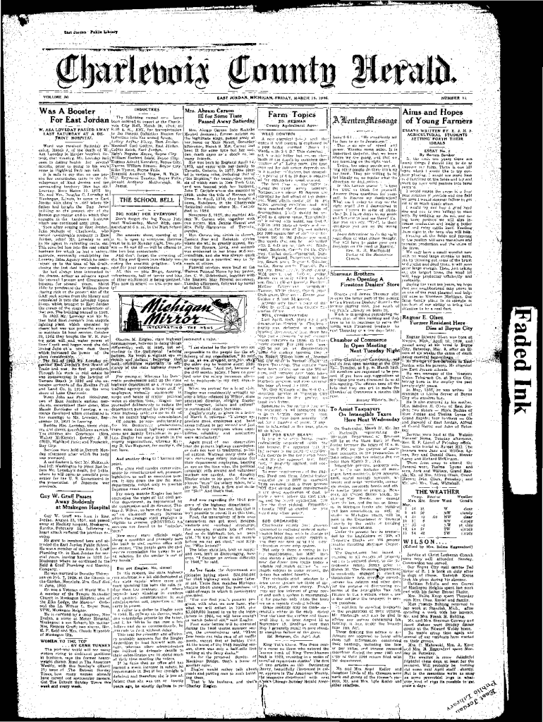 i M t JordanfabU* Library\' \" \" T \' W \" W \"\'L\"l iM\'miwit jpttetoii VOLUME 50Was A Booster For East JordanINDUCTEES The following named men have been ordered to report at the Charlevoix City Hall, March 20, 1 9 4 ( i , a t 8:;)0 a. m., EST, for transportation to the Detroit Induction Station for induction into the armed forces. LeRoy Arthur Nicoy, East Jordan. Marshall Carl Gothro, East Jordan. Calvin Reich, East Jordan. Ralph Eugene Mapes, Boyne City. William\' Herbert Seals, Boyne City